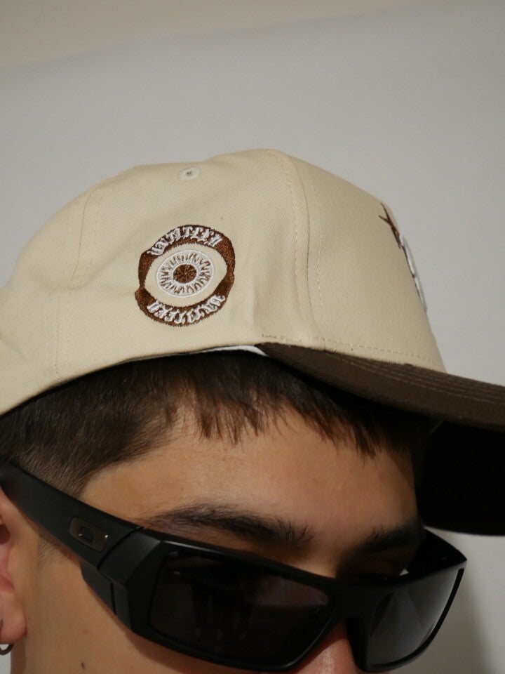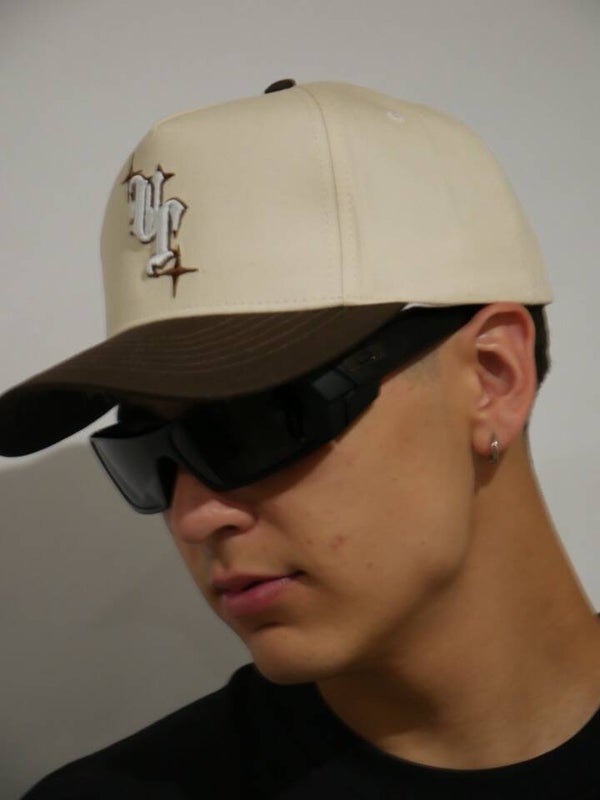 This structured cap pairs a beige crown with a brown brim, featuring stitched lines for texture. A bold “UT” embroidery sits up front with spark-like accents, while a side patch adds a touch of heritage flair. It’s a sleek, casual piece with streetwise style.