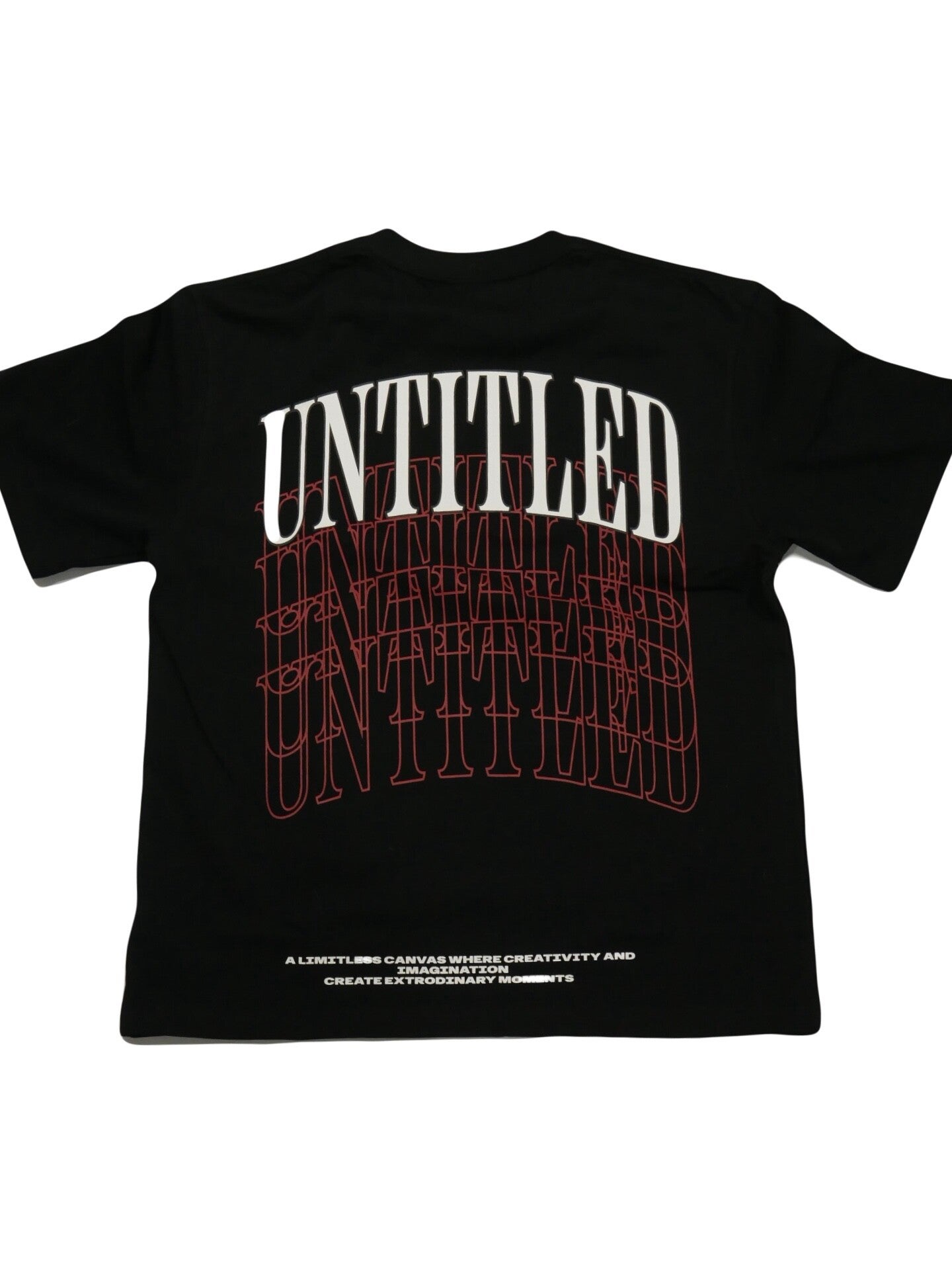 This black t-shirt features a bold typographic design centered on the word “UNTITLED.” At the top, the word appears in large white lettering, followed by multiple red repetitions that create a layered, expressive texture. Beneath it all, a subtle statement reads: “A LIMITLESS CANVAS WHERE CREATIVITY AND IMAGINATION CREATE EXTRAORDINARY MOMENTS,” framing the piece as an homage to uninhibited artistic freedom. It’s minimalist, yet conceptually rich—perfect for those who like their fashion with depth.